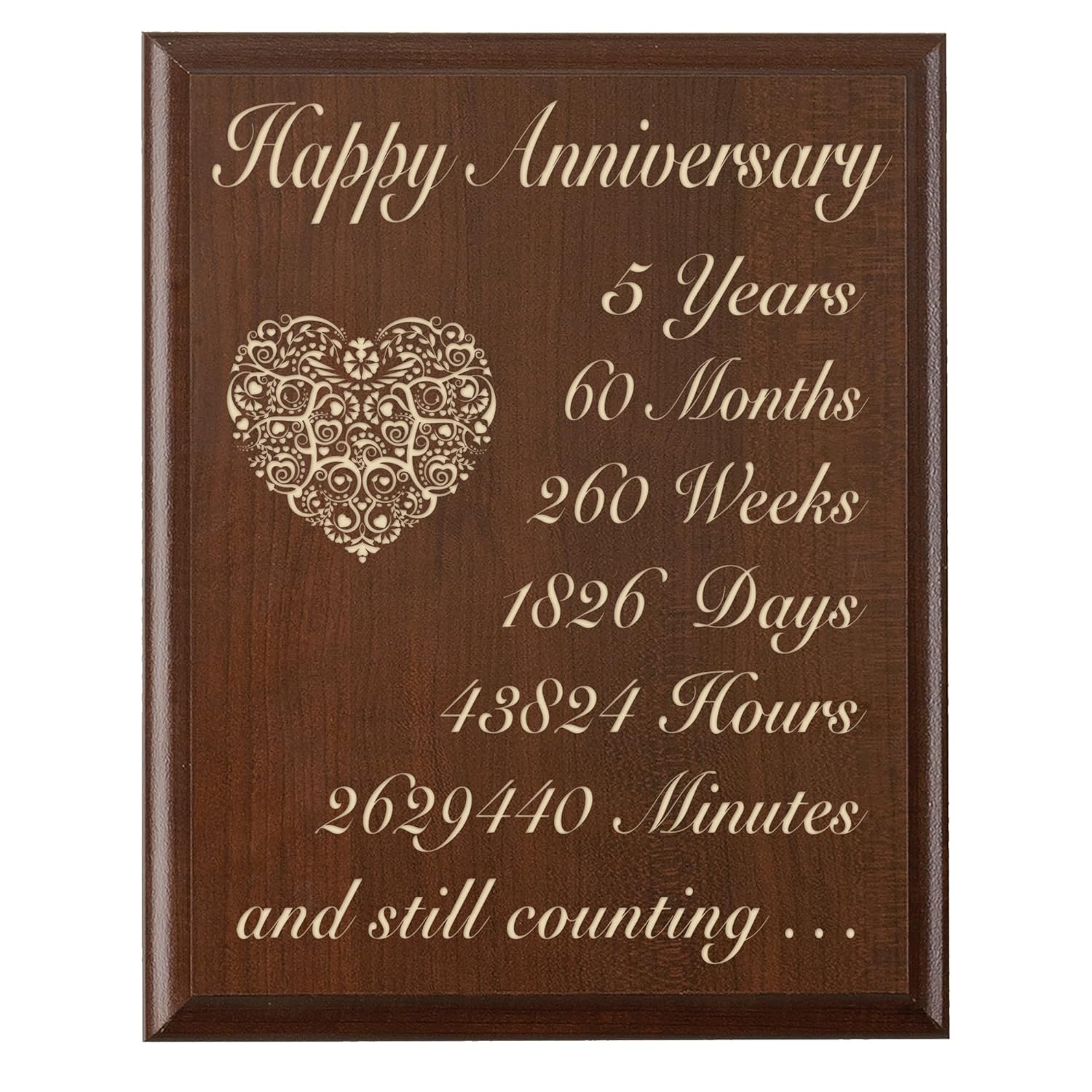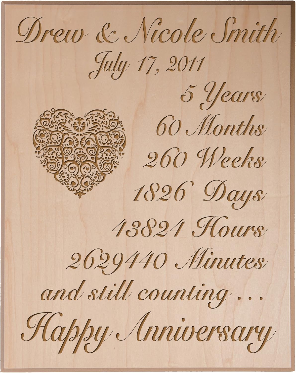 With so many colors, themes and items to pick from, it couldn't be easier to mix and match in order to create a truly heartfelt gift that is perfectly suited to the recipient. Impress your beloved wife on your 5th anniversary with one of these beautiful gifts. It's been 5 years since you've said i do, and nothing can compare to the time you've spent with your spouse. A homemade plaid with sleeves or an orthopedic pillow for a sofa can be a good 5 year dating anniversary gift. Wooden anniversary gifts make great gifts for him and her and we have lots to choose from that they will love. It sounds old fashioned, but these utensils reflect the many shared meals together and the closer bond that has developed as a result. Modern 5th anniversary gift each wedding anniversary has customary modern gifts as well, and silverware has been for honoring 5th wedding anniversaries. For 5th anniversary symbols, the 5th anniversary is known as the wood anniversary. Capturing the closeness and sweet intimacy of a couple in love, this willow tree figurine makes a touching anniversary gift for her. For more romantic flavor, you may pack it in the wooden gift box and present to your spouse. 5.0 out of 5 stars 2. A truly spectacular wedding anniversary gift is a few days trip, just the two of you, to a romantic destination. And there's a long tradition of making all kinds of surprising things out of this diverse and organic material.